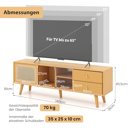 【Zusätzlicher Stauraum & Verstellbares Regal】Der TV-Ständer verfügt über 2 Staufächer und 2 Schubladen. Und die Staufächer verfügen über glatte Schiebetüren aus Glas und PE-Rattan. Besonders hervorzuheben ist, dass das die Fächer des Schrankes in 3 Stufen verstellt werden.