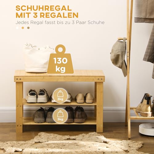 Ordnung im Eingangsbereich: Eine Kombination aus Schuhregal und Schuhbank, um Platz zu sparen. Dieser Schuhbank aus Bambus hat die perfekte Größe und bietet Stauraum auf drei Etagen. Jede der unteren Regalebenen kann bis zu drei Paar Schuhe aufnehmen, während die obere Ablagefläche ideal ist, um Ihre Arbeitstasche und Handtasche am Ende des Tages abzulegen